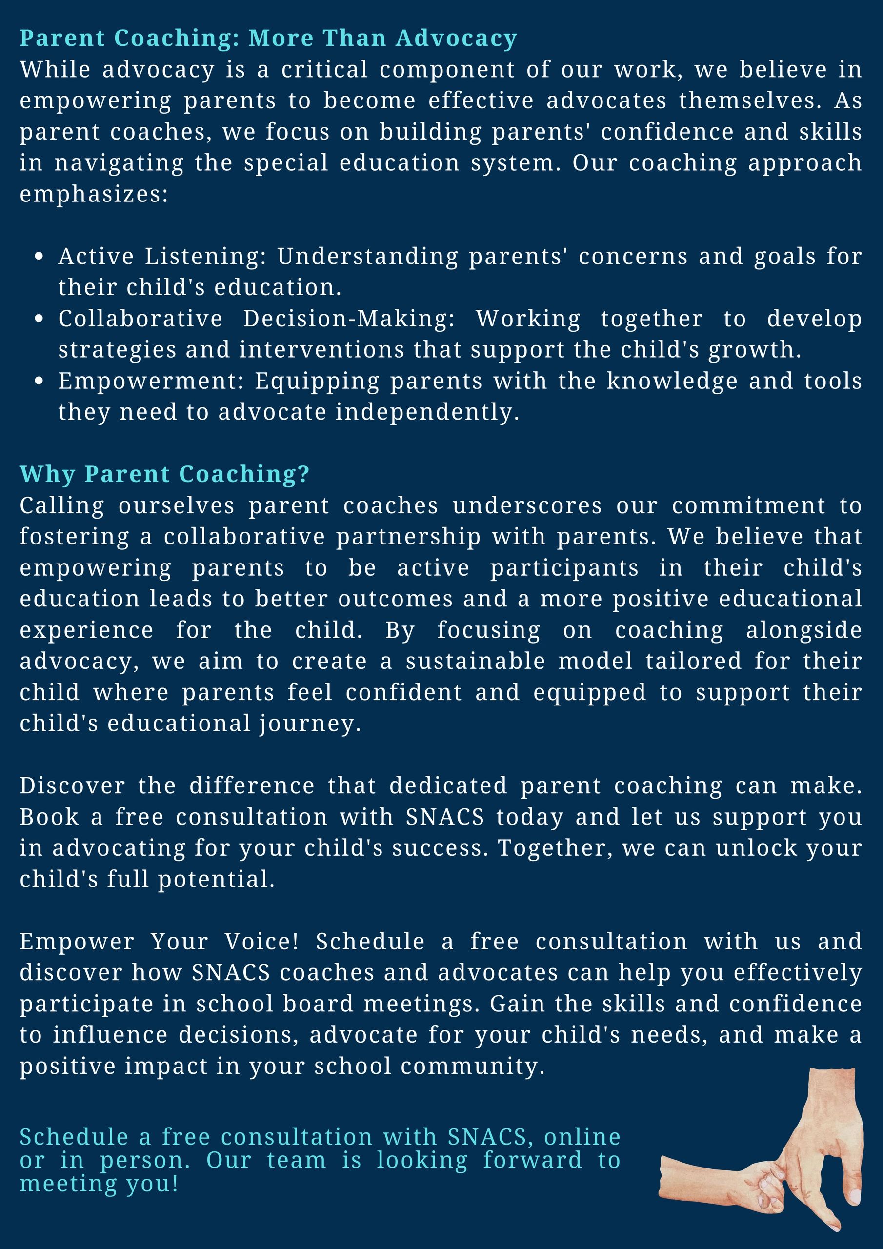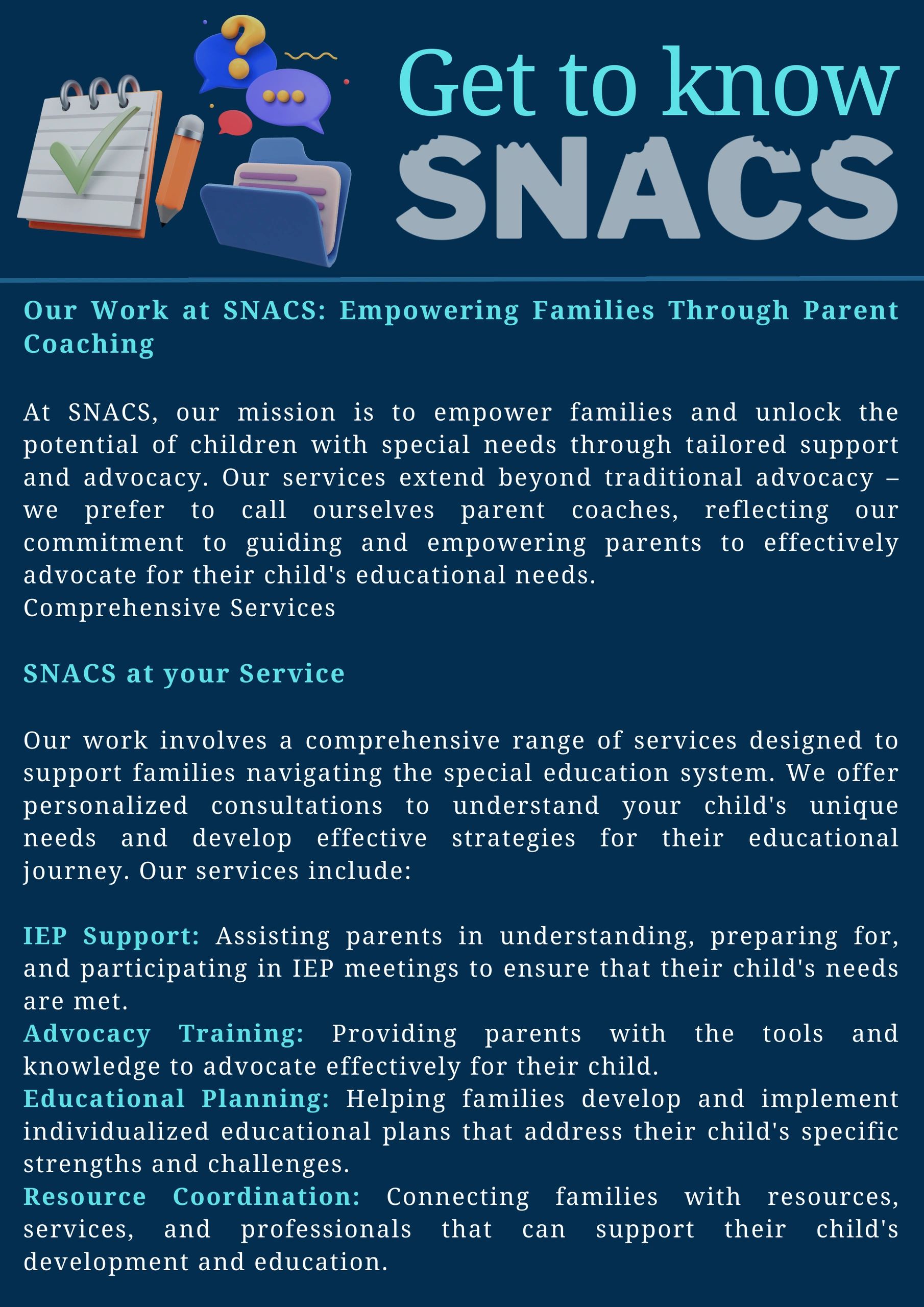 At SNACS, we believe every family deserves the tools, guidance, and support to advocate confidently for their child or Family Member’s needs—whether it’s in school, with services, or beyond.
