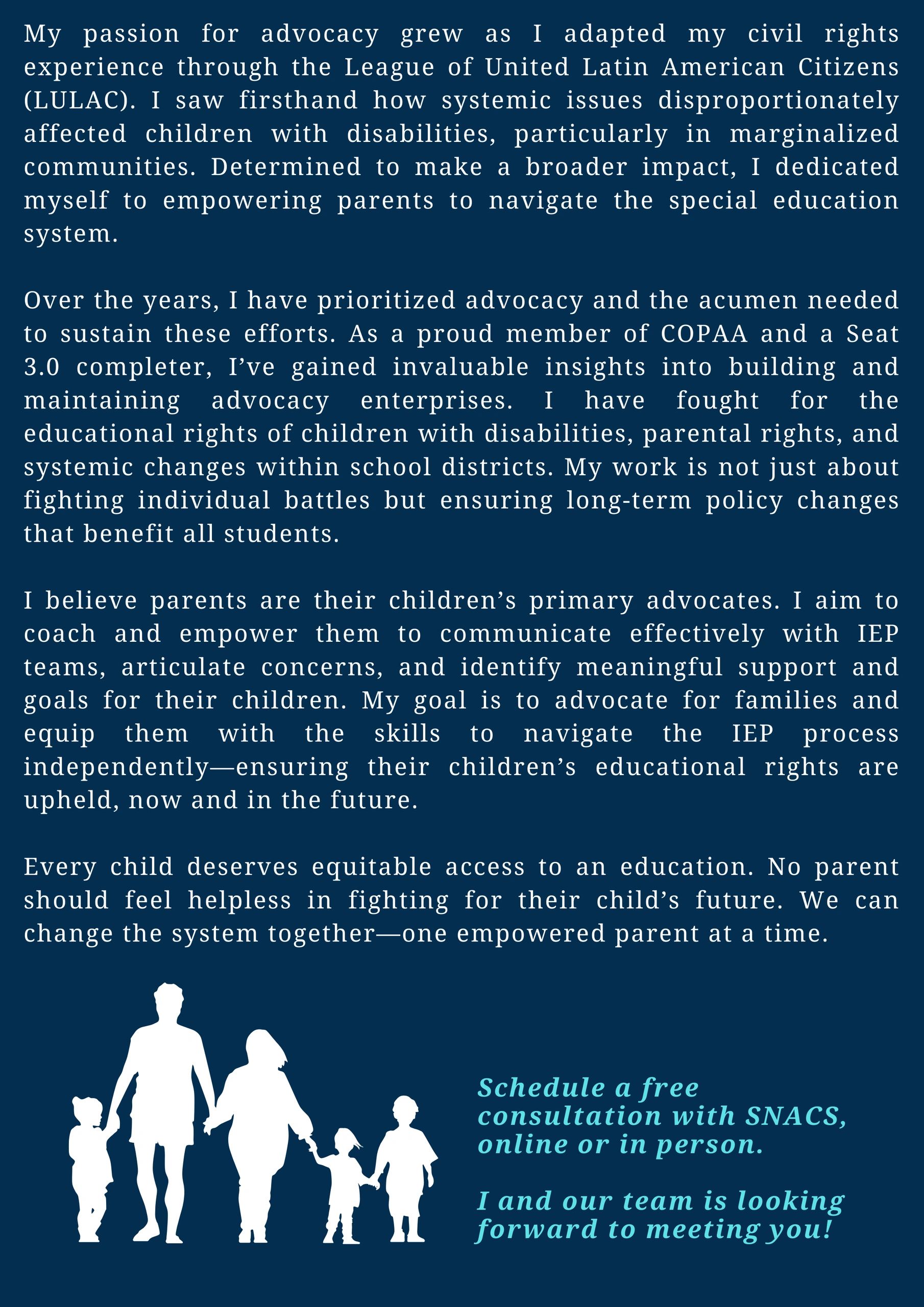 Families trust SNACS because we are committed, compassionate, and experienced in helping you navigate systems like IEPs, 504 plans, IHSS, and Regional Center services.